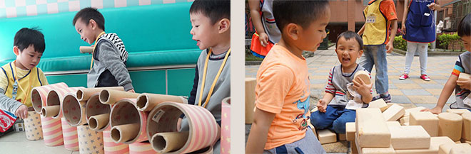 輪胎,紙捲和木塊,愈是給孩子極少的限制,愈是能展現出極大的空間!所有的材料沒有一定的目的跟標準玩法,所有的遊戲規則,由孩子自己決定!